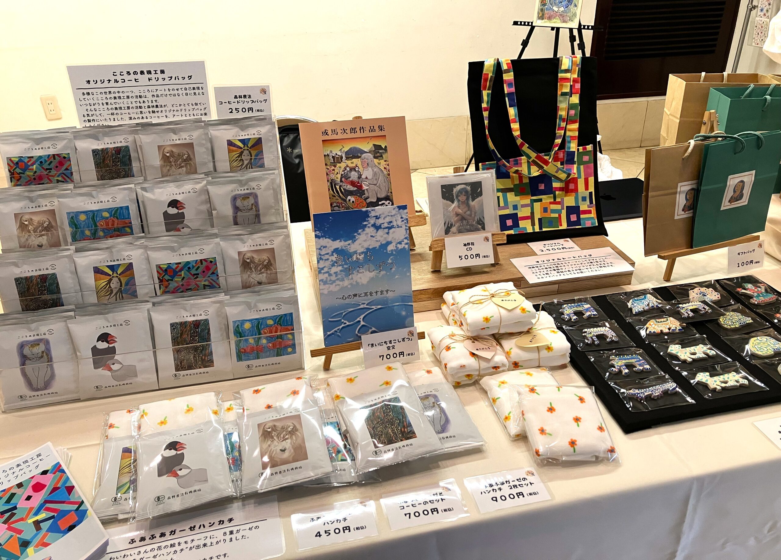 中には、バッグやハンカチ、ドリップコーヒーのパックデザインになった作品もあり、耕心館ではグッズなどの販売を行っています。