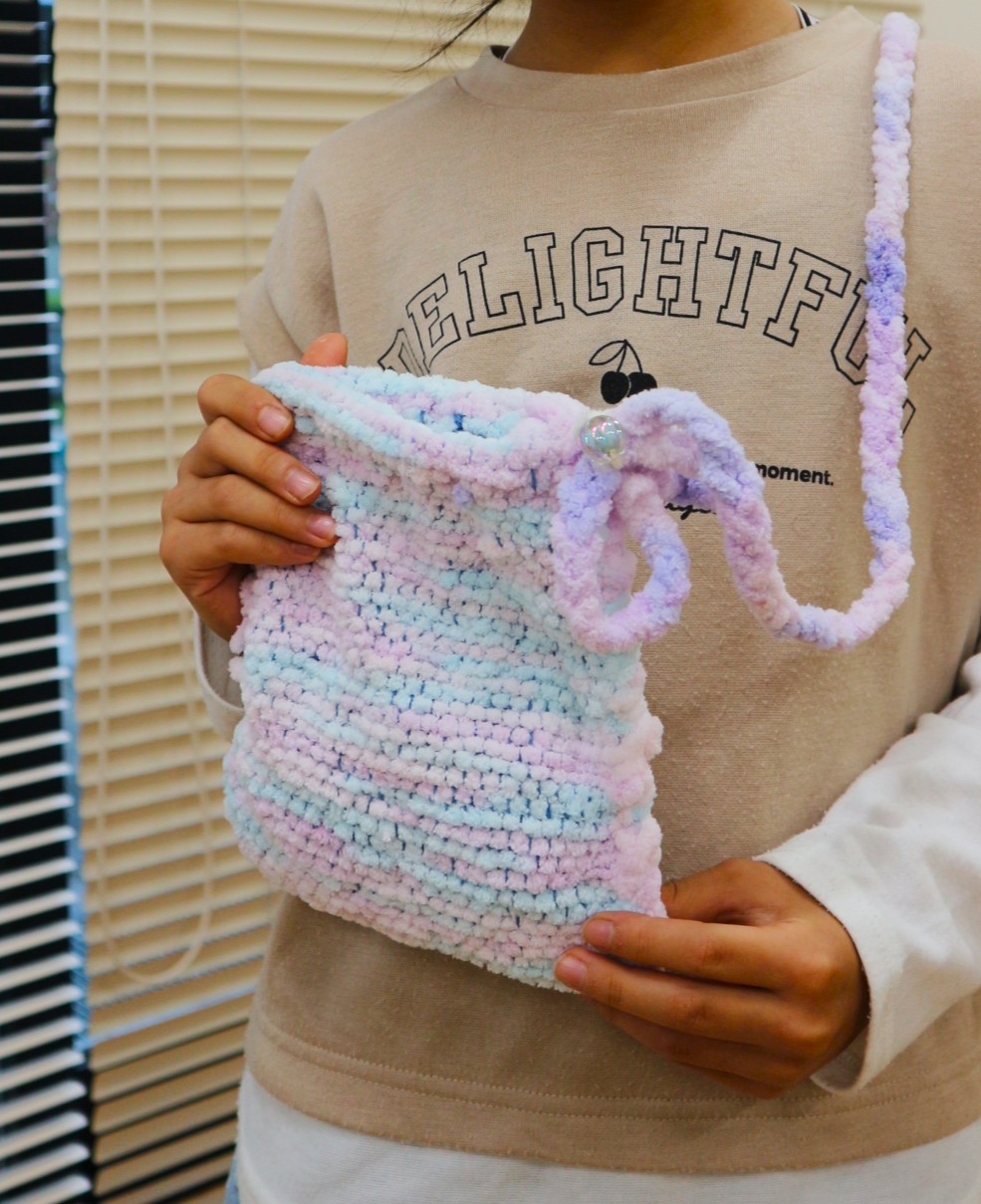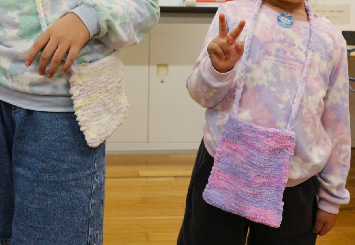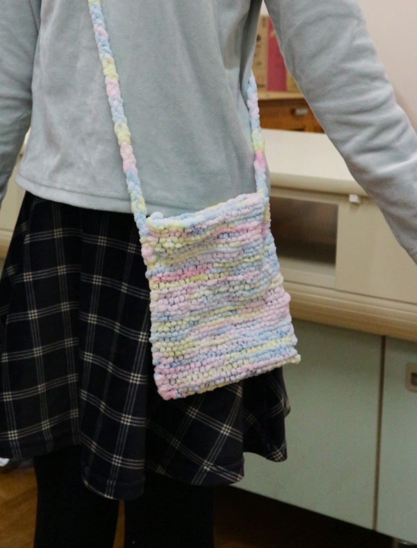 今回は、ふわふわのモールを使って織り、可愛いサコッシュをつくりました。