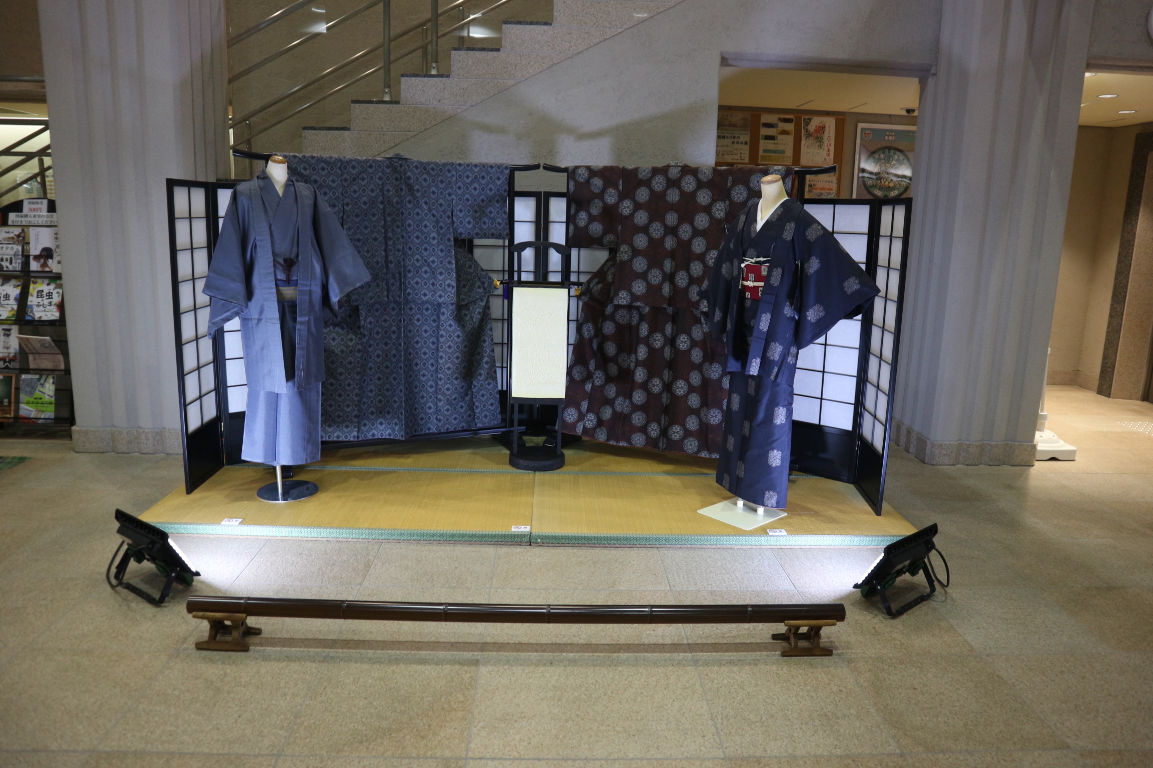 エントランスホールの着物も素敵ですよね。これらの着付けやセッティングは、当館の事業でお世話になっている織り姫会にお願いしました。