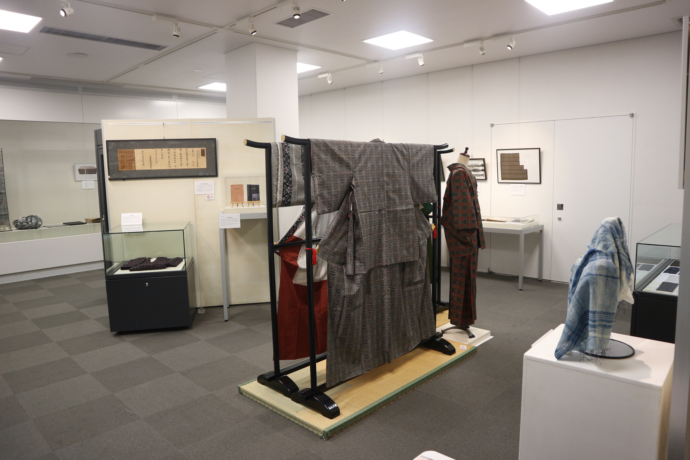 村山大島紬の着物・反物が展示されています。一つ一つ趣が異なりますが、全て板締め染色の技法で染められ、村山大島紬になります。
