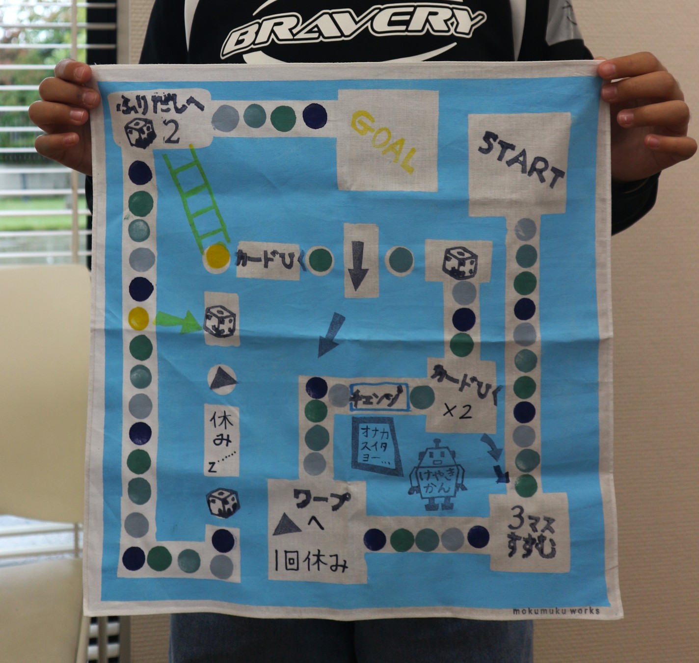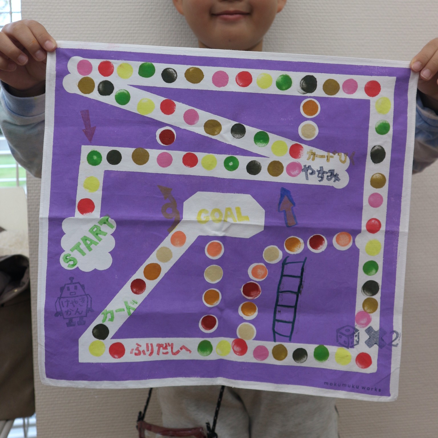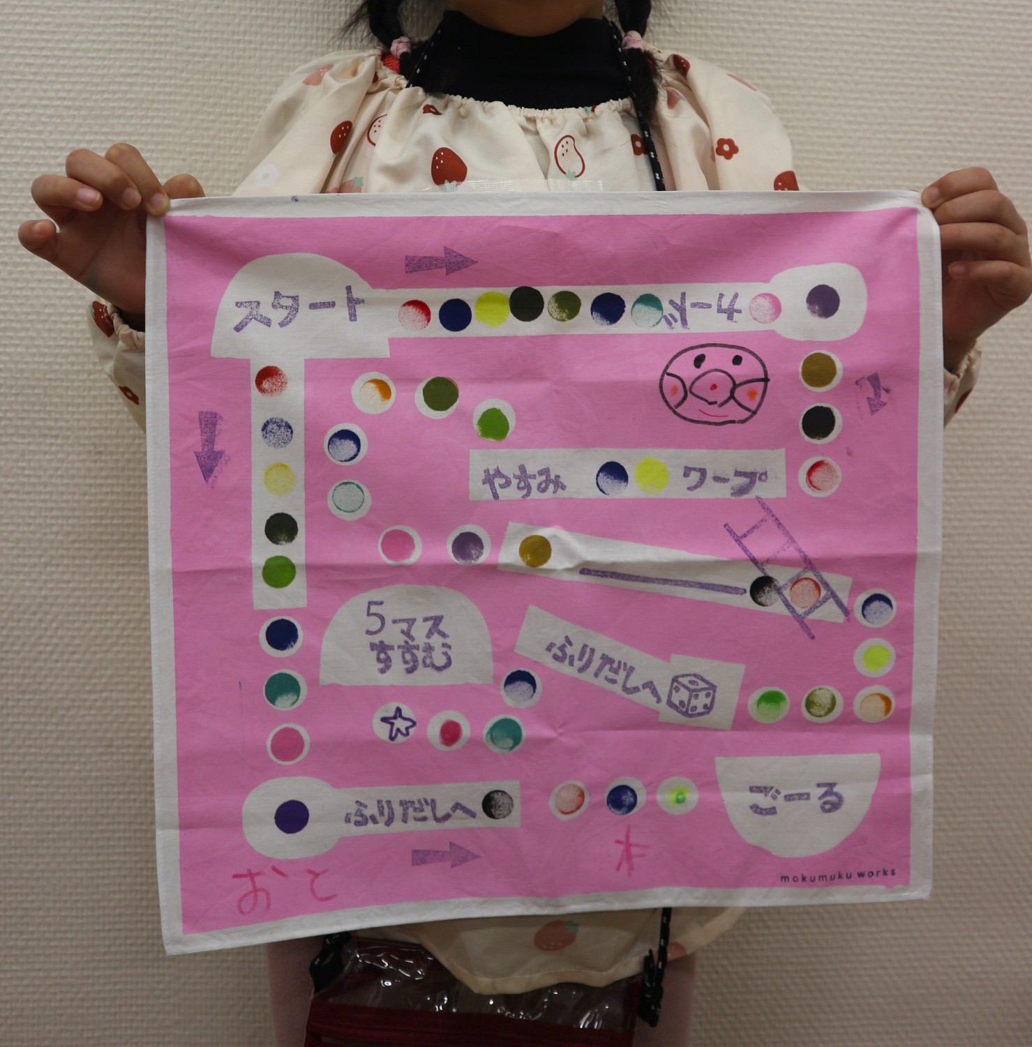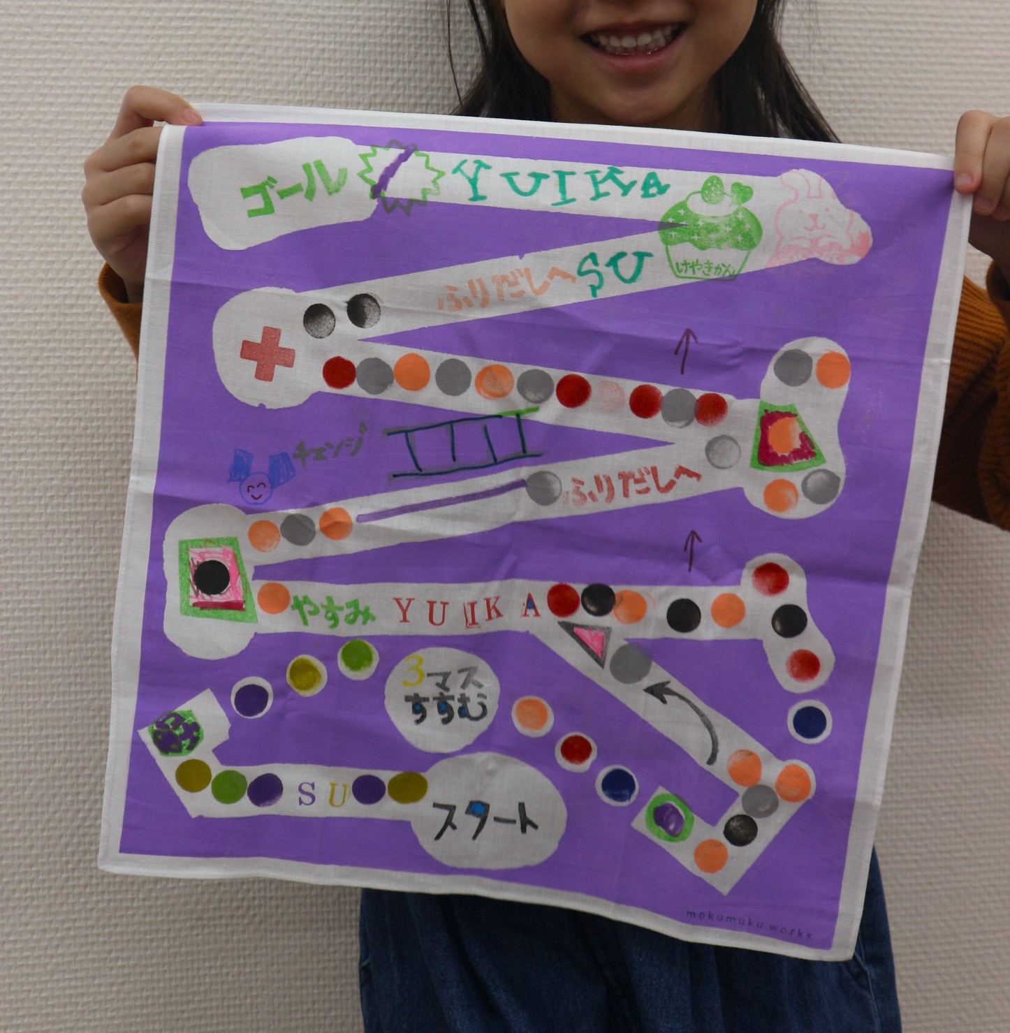 この体験教室「すごろくハンカチ」では、その名の通り、ハンカチにスタンプを押してすごろくを完成させて、遊んでみました!