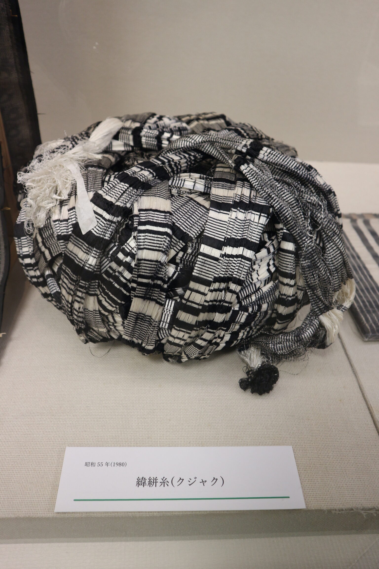 染められた糸(絣糸)がこちらになります。この糸に捺染を加えることで、緯糸が完成します。