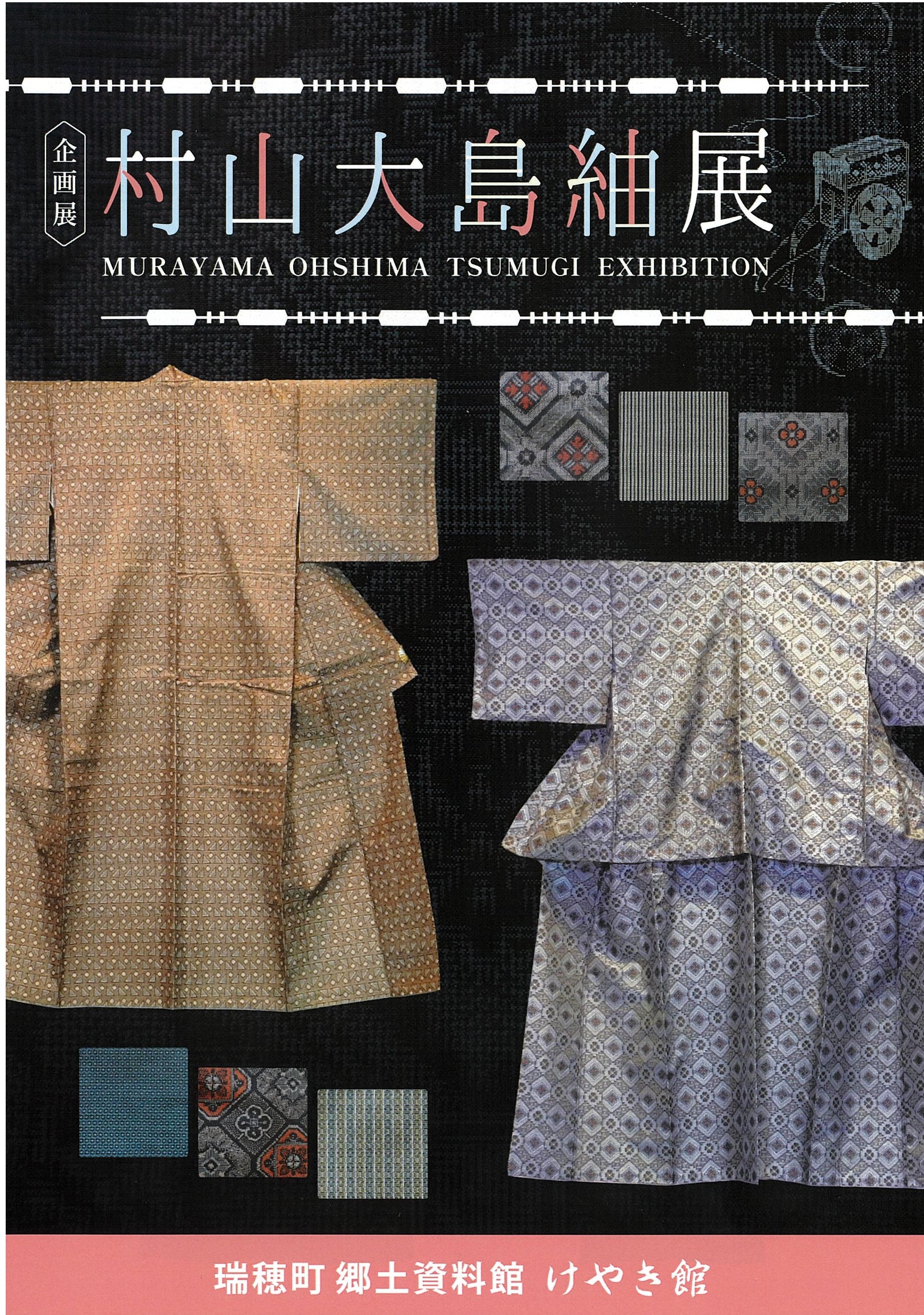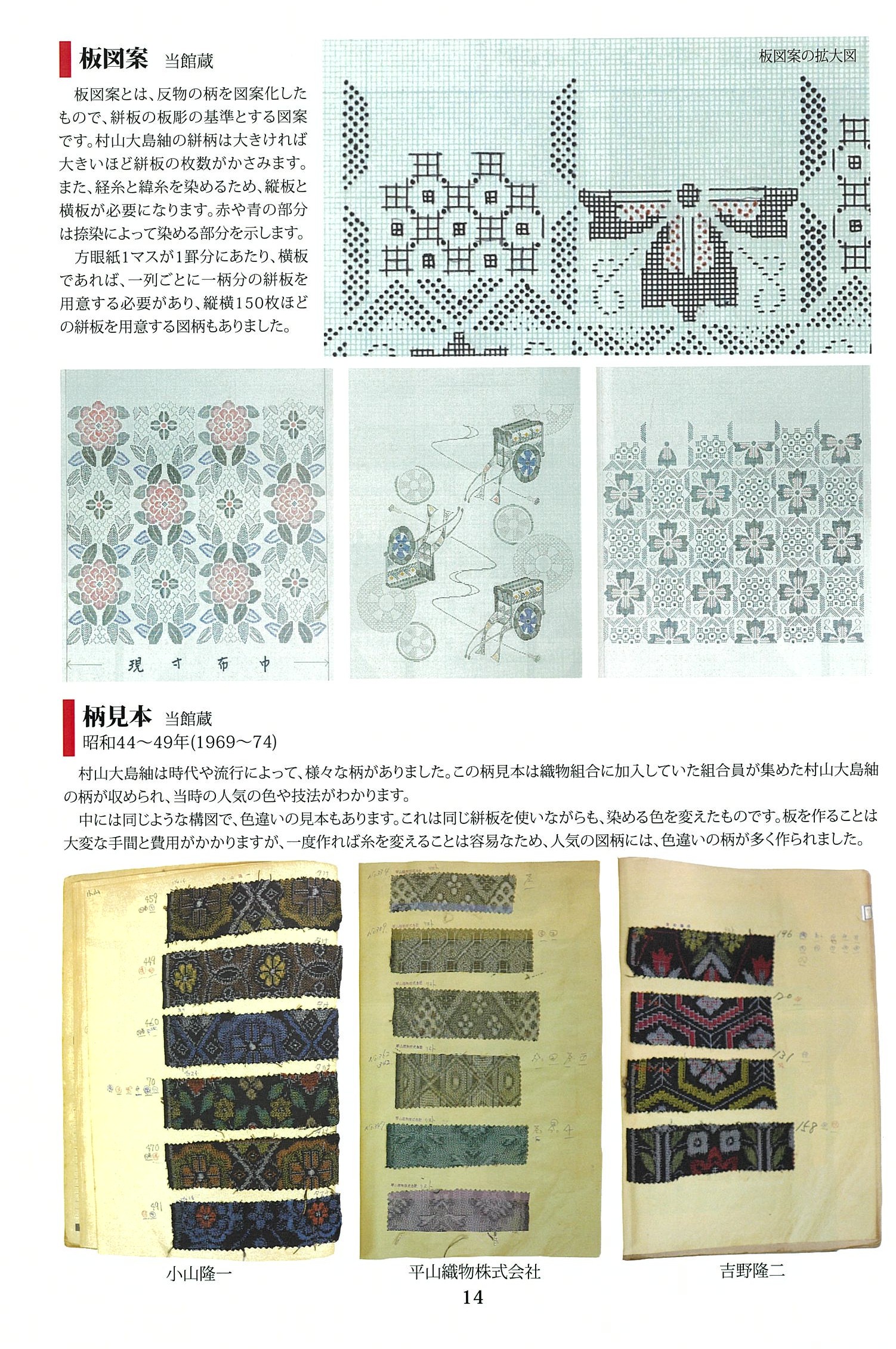 村山大島紬の見本帖や板図案、実際の着物や反物から村山大島紬のデザインの移り変わりを見やすく示しています。