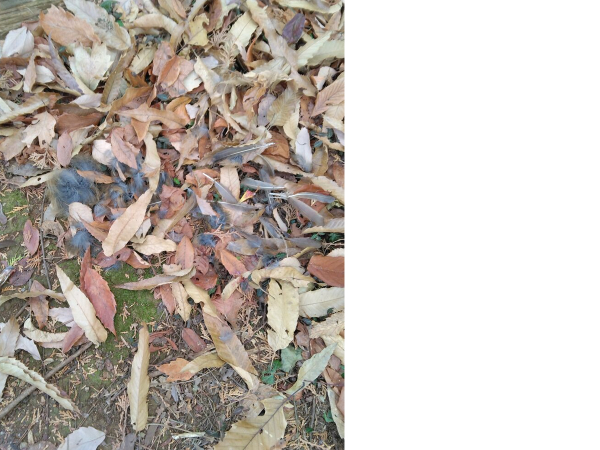 途中、猛禽類に襲われ無残な状態になったガビチョウの羽を発見することもできました。↓