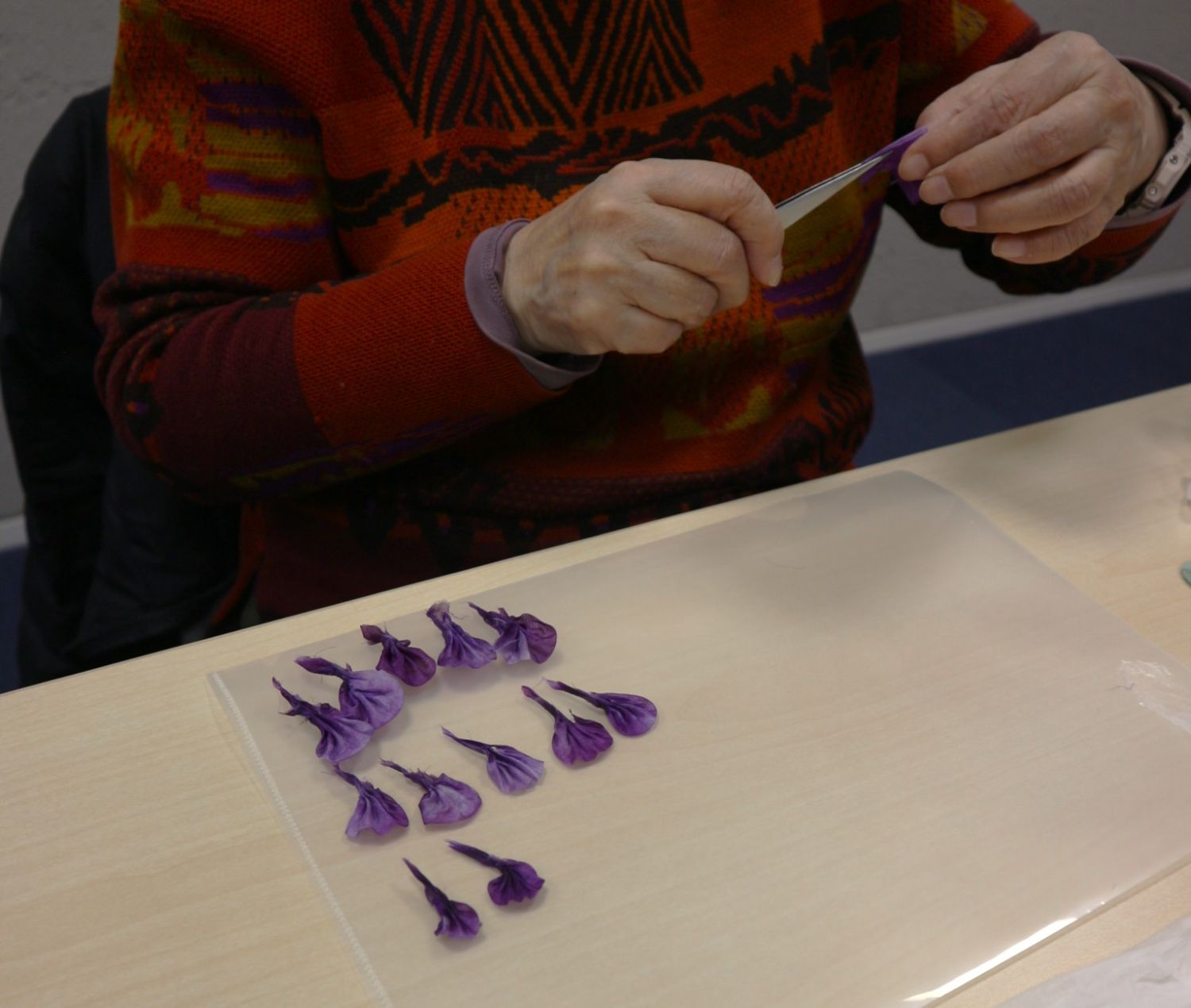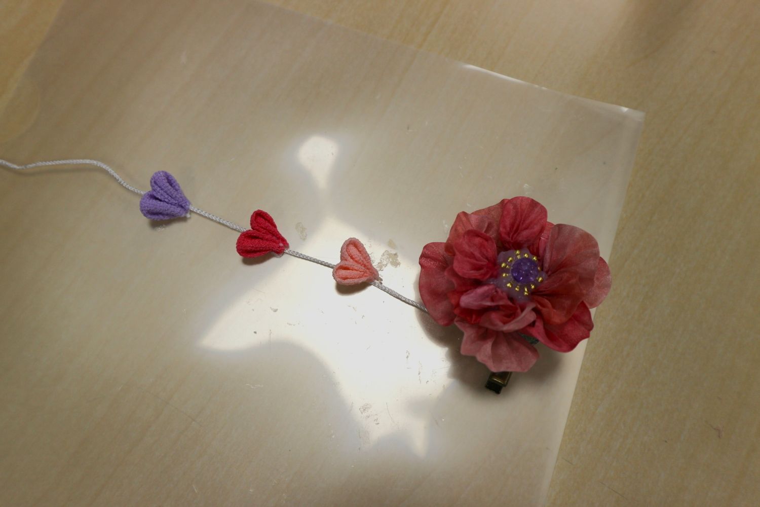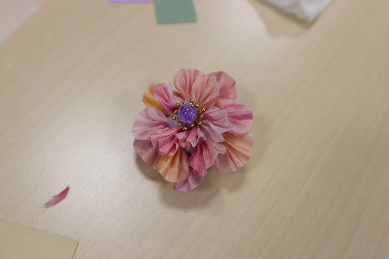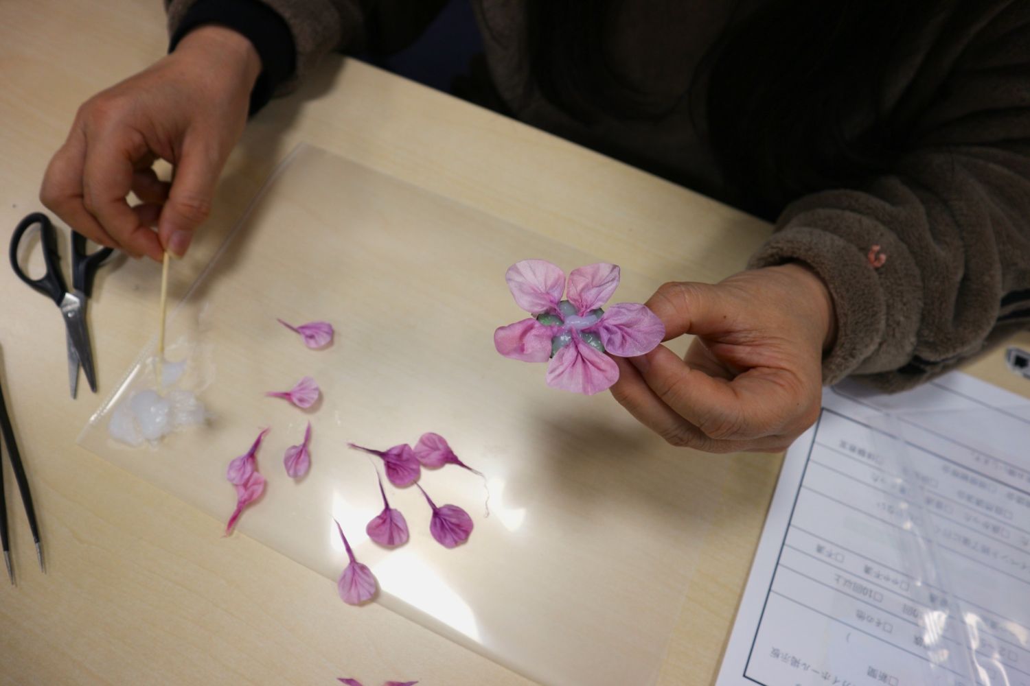 いろいろな色に染めてきていただいた小さな絹地を、ピンセットを使い、花びら1枚1枚を形作ります。