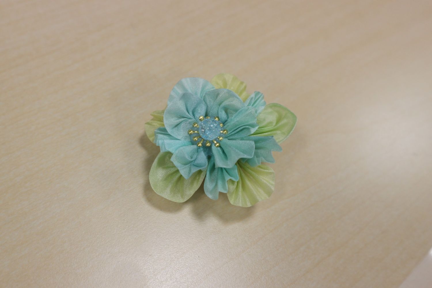 羽二重(光沢感のある薄手の絹)を使った華やかなお花のブローチを作りました。