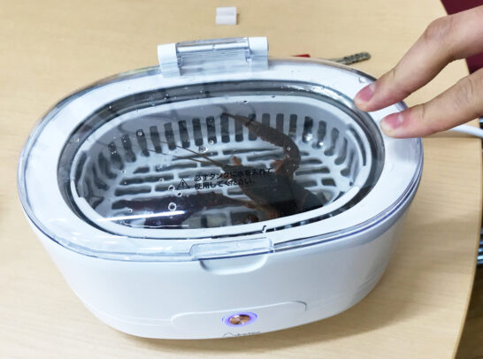 座学の後、解剖の手順を確認し、各自で使用する個体を水槽からすくい、ザリガニミミズなどの寄生虫が付いていないかを確認するため、小物用の超音波洗浄機にかけました。
