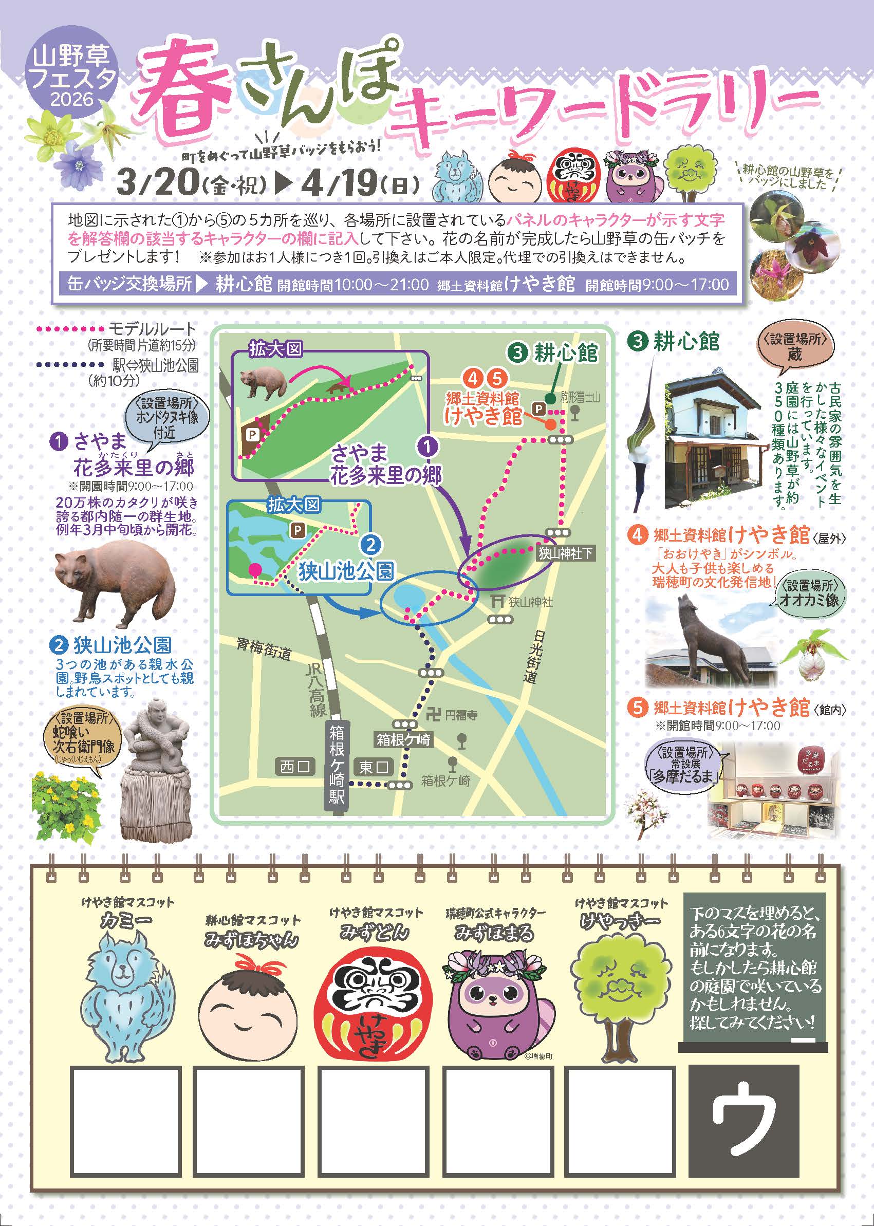 ※5カ所の地図と解答欄は「山野草フェスタ2026」のチラシにあります。