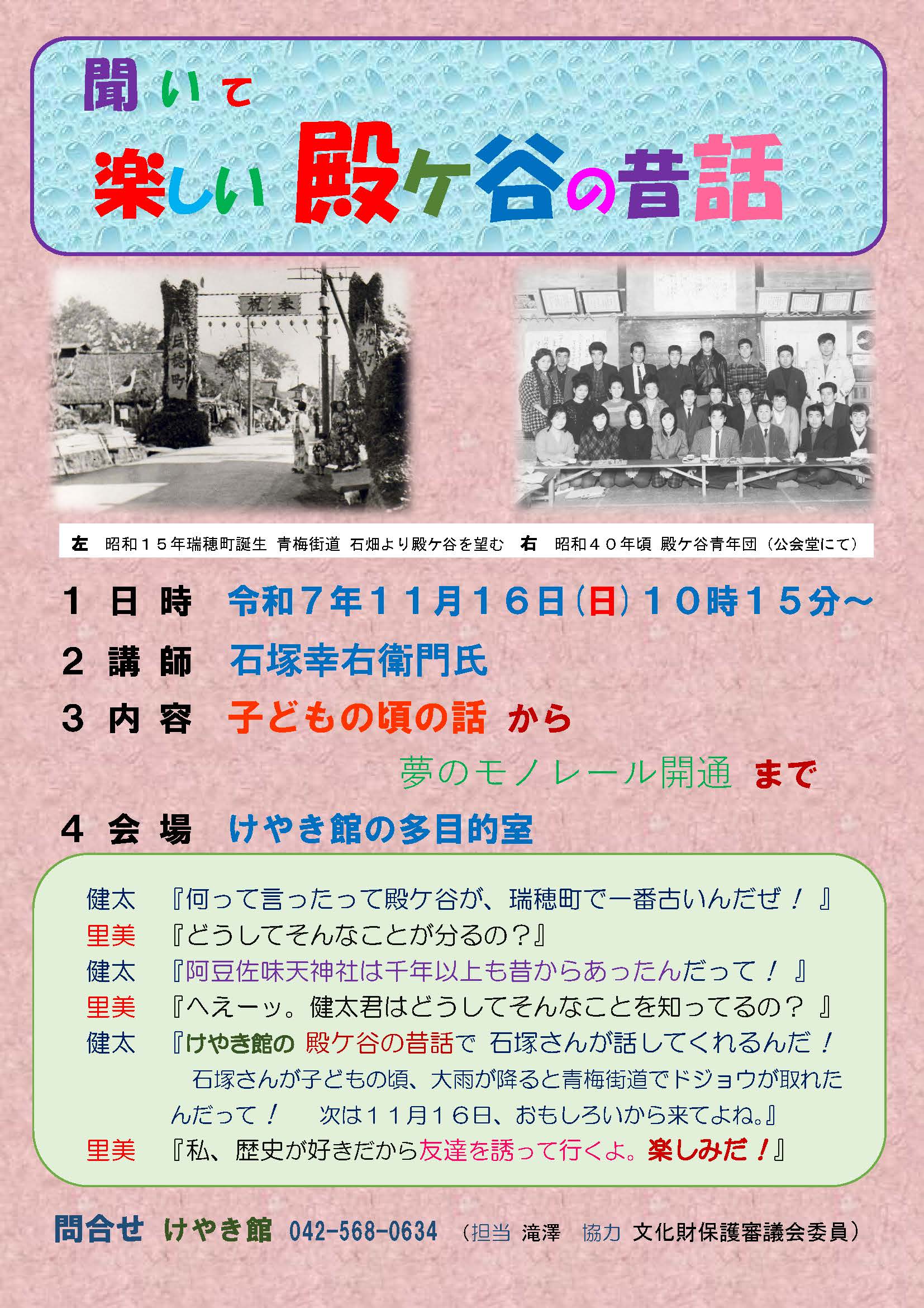日 時:令和7年11月16日(日)10時15分〜 講 師:石塚幸右衛門氏 内 容:子どもの頃の話 から夢のモノレール開通 まで 会 場:瑞穂町郷土資料館 けやき館 多目的室 参加費:無料