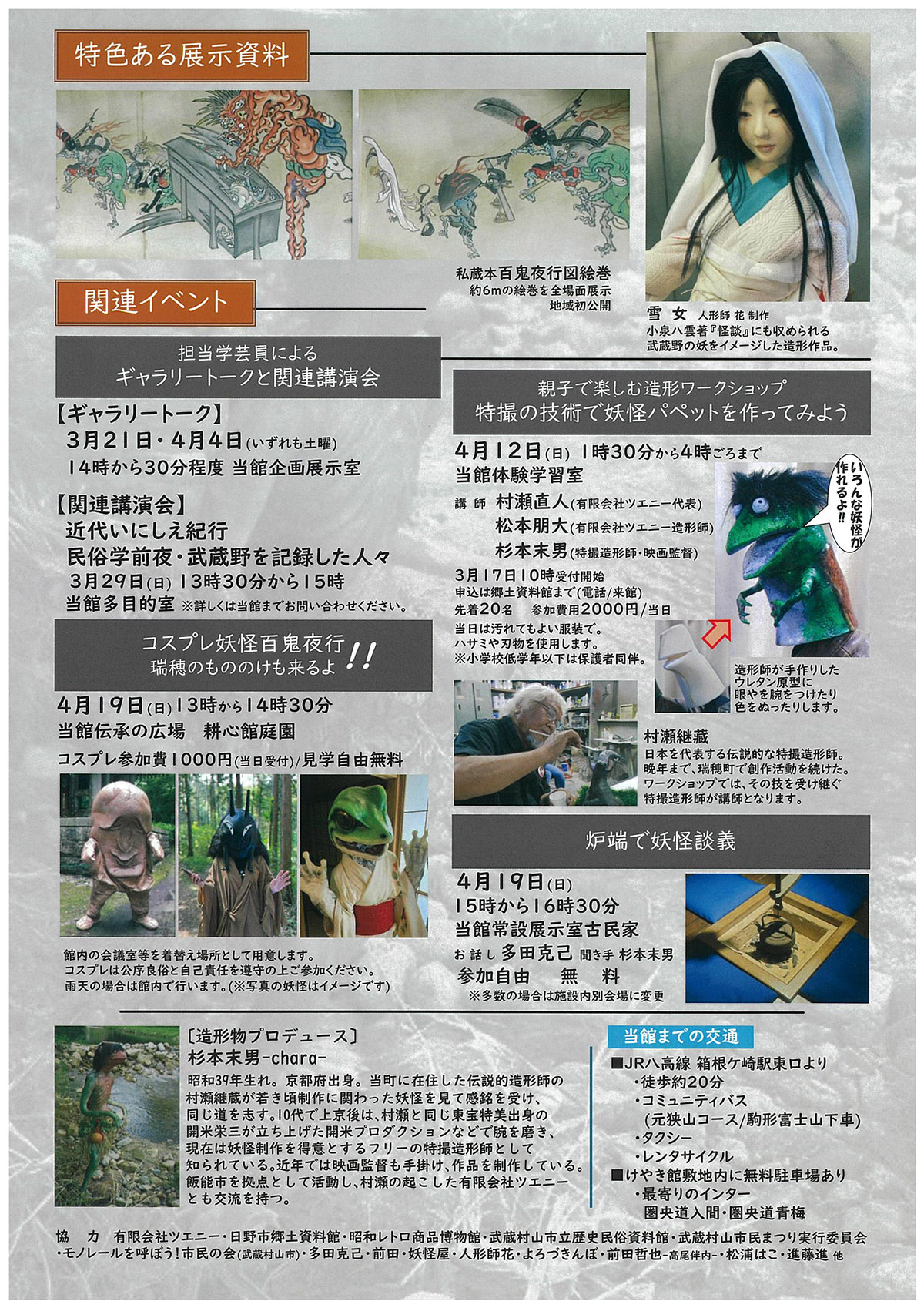 有限会社ツエニー・日野市郷土資料館・昭和レトロ商品博物館・武蔵村山市立歴史民俗資料館・武蔵村山市民まつり実行委員会・モノレールを呼ぼう!市民の会(武蔵村山市)・多田克己・前田・妖怪屋・人形師花・よろづきんぽ・前田哲也-高尾伴内-・松浦はこ・進藤進 他